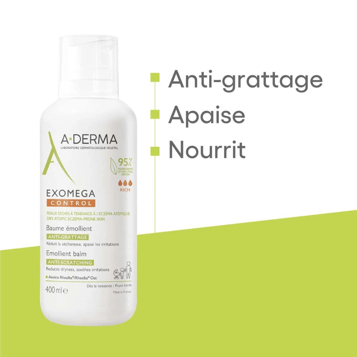 Les laboratoires A-Derma ont formulé ce baume relipidant sous contrôle dermatologique, avec plus de 95 % d’ingrédients d’origine naturelle, sans parfum et sans conservateurs. Dès la première application du baume émollient Exoméga-Control, la peau retrouve un confort et un apaisement. Ce soin peut être utilisé par tous les membres de la famille, y compris sur les peaux à tendance atopique, pour diminuer les sensations de grattage.
