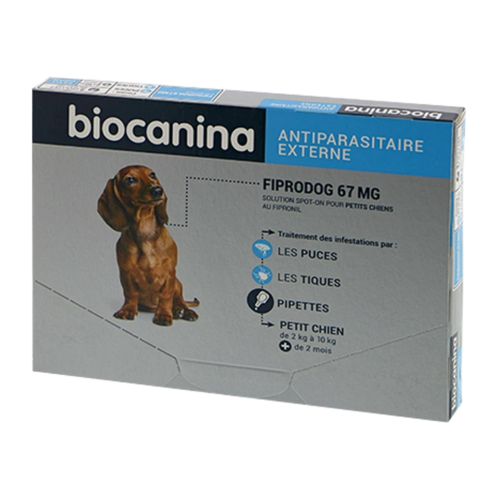 Fiprodog Spot On Petit Chien 67mg de BIOCANINA est un traitement des infestations par les puces (Ctenocephalides spp.). L’efficacité insecticide prévient de toute nouvelle infestation par les puces pendant 6 semaines. Le médicament peut être intégré dans un programme de traitement de la Dermatite par Allergie aux Piqûres de Puces (DAPP), lorsque ce diagnostic a été posé par un vétérinaire. Bien que le produit ne montre pas toujours une efficacité acaricide immédiate (des tiques peuvent être présentes après 48 heures), il possède une activité acaricide persistante jusqu’à 4 semaines contre Dermacentor variabilis et jusqu’à 3 semaines contre Rhipicephalus sanguineus.