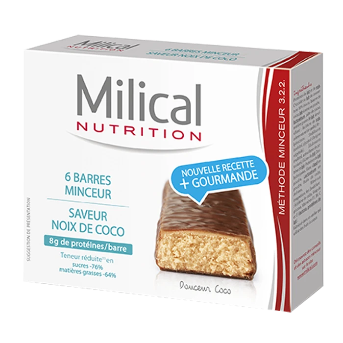 Les barres minceur Milical Chocolat Noix de Coco constituent un en-cas très agréable, pour un apport calorique réduit. Elles permettent de conjuguer plaisir et équilibre nutritionnel dans le cadre d’un régime amaigrissant. Cette barre gourmande hyperprotéinée est aromatisée à la noix de coco et enrobée de chocolat au lait. Elle offre un taux réduit en matières grasses et en sucres.