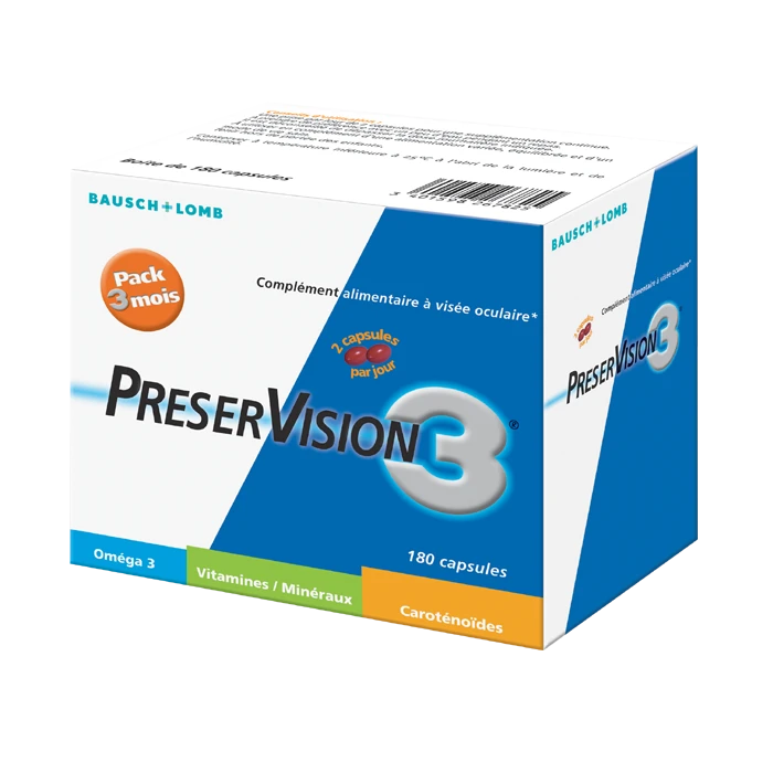 Le complément alimentaire PréserVision du laboratoire Chauvin Bausch + Lomb est formulé pour lutter durablement contre le vieillissement oculaire, tout en protégeant les cellules photosensibles de la rétine du stress oxydatif. Développé par des experts en ophtalmologie, il renferme des vitamines et des minéraux sélectionnés avec soin pour leurs propriétés antioxydantes, ainsi que du DHA et des pigments maculaires particulièrement bénéfiques pour la santé visuelle. Appartenant à la famille des acides gras oméga-3, l’acide docosahexaénoïque protège l’intégrité des membranes lipidiques dans la rétine et aide à régénérer la rhodopsine, un pigment visuel responsable de la sensibilité de l’œil à la lumière.