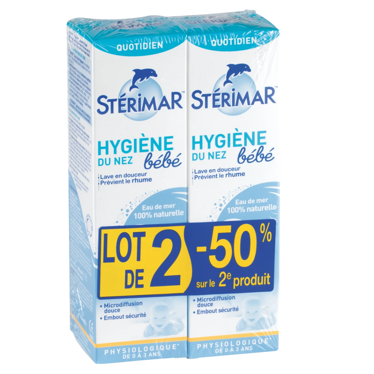 Le Spray Nasal Hygiène du Nez de STERIMAR aide à dégager le nez de bébé de ses impuretés, facilite la respiration et la prise du biberon, renforce la protection de la muqueuse nasale et prévient les pathologies de la sphère ORL. Ce lot est composé de 2 sprays de 100ml.