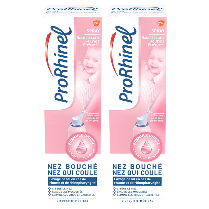 Facile à appliquer, le spray peut être utilisé dans n’importe quelle position sans risque de blessure. Grâce à sa formule unique, le spray favorise l’élimination des agents infectieux qui se trouvent dans le nez et qui sont responsables de réactions inflammatoires. Il contribue ainsi à soulager les désagréments du rhume et à libérer la respiration en fluidifiant les sécrétions nasales qui obstruent le nez. Proposé en lot de 2, le Spray Nasal Nourrissons et Jeunes Enfants de ProRhinel est également recommandé pour humidifier les fosses nasales au quotidien.