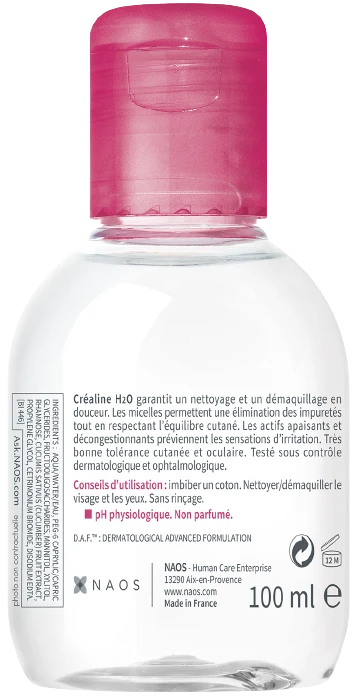 L’Eau Micellaire Démaquillante Créaline H2O de Bioderma est spécialement élaborée pour nettoyer en douceur les peaux sensibles ou réactives. Inspirée de la biologie de la peau, elle peut être utilisée sur l’ensemble du visage, y compris les yeux, et ne nécessite pas de rinçage. L’efficacité de son pouvoir nettoyant élimine le maquillage, même waterproof, en un minimum de passages, ce qui limite les irritations cutanées. Testé sous contrôle dermatologique et ophtalmologique, ce nettoyant non délipidant offre une très haute tolérance et prend soin de toutes les peaux, même les plus fragiles. Sans savon ni parfum et au pH physiologique de 5.5, sa formule ultra douce est composée d’une eau hautement purifiée, de qualité pharmaceutique, ainsi que de micelles qui capturent les impuretés dans le plus grand respect des yeux et de l’équilibre du microbiote de la peau. Elle est constituée d’un seul tensio-actif, la glycérine, dont la structure est proche de celle des lipides naturellement présents dans le derme. Le glycérol préserve la peau des agressions extérieures susceptibles d’accentuer sa sensibilité, en formant une couche protectrice invisible qui réduit leur impact sur l’épiderme. Les actifs calmants et décongestionnants de l’eau micellaire du laboratoire Bioderma aident à prévenir les sensations d’inconfort et la sécheresse cutanée, souvent causés par le nettoyage quotidien. Ils maintiennent le film hydrolipidique intact afin de laisser la peau souple et hydratée au quotidien. Dès la première application, le soin hypoallergénique Créaline H2O procure une sensation de fraîcheur instantanée. La peau est propre, douce et durablement apaisée, le teint est lumineux et éclatant de santé.