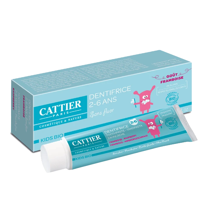 Le Dentifrice Enfant 2-6 Ans Goût Framboise de Cattier renferme de la silice, des extraits de feuilles d’aloès et de délicieux arômes de framboise, pour faciliter le brossage des dents des enfants de 2 à 6 ans. Il les aide à acquérir l’habitude d’une bonne hygiène bucco-dentaire quotidienne et à devenir progressivement autonomes. Le Dentifrice Enfant 2-6 Ans Goût Framboise de Cattier contient un extrait de feuilles d’aloès, une plante grasse, dont les vertus protectrices et apaisantes sont réputées pour égaler l’efficacité du fluor dans les soins de bouche. Ce soin dentaire participe à l’élimination de la plaque dentaire, sans décaper les dents et sans irriter les muqueuses. Anti-inflammatoire et cicatrisant, il atténue les petites plaies buccales et permet de soulager la douleur liée aux aphtes. Grâce à la silice présente dans sa formule, ce soin favorise la tonicité des gencives. Optimisant la synthèse de la vitamine D par le corps, il aide à conserver la solidité de l’émail et préserve les dents des caries. Avec sa formule haute tolérance, le Dentifrice Enfant 2-6 Ans Goût Framboise de Cattier est idéal en complément d’une brosse à dents souple. Sans fluor ni sulfates, il peut être utilisé chaque jour, sans provoquer d’irritation et de sensibilisation des dents et des gencives.