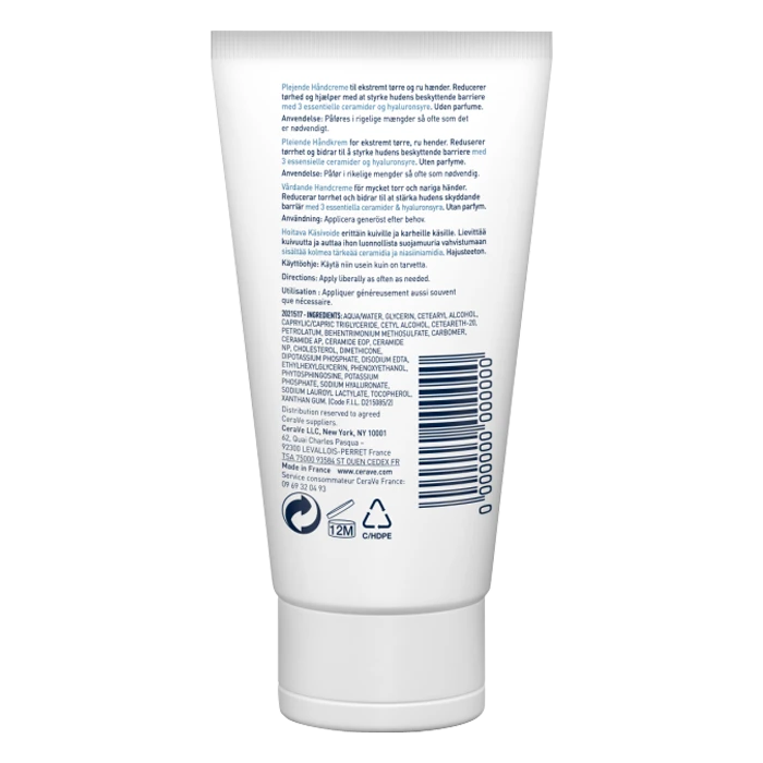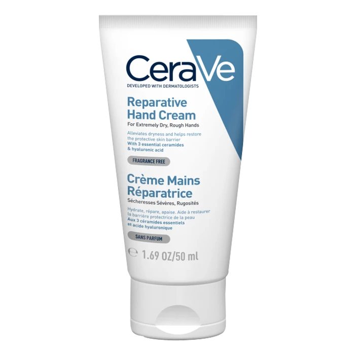 La Crème Mains Réparatrice CeraVe est un soin dermatologique destiné à rétablir la fonction barrière de la peau sujette aux irritations et aux crevasses. Elle est idéale pour redonner souplesse aux mains abîmées et les aider à mieux réagir face aux agressions du quotidien. La Crème Mains Réparatrice CeraVe est formulée à base de 3 types de céramides essentiels qui contribuent à limiter la perte en eau de la peau par évaporation. Elle contient des esters de jojoba, dont les vertus émollientes participent à la restauration de son film hydrolipidique. En réduisant l’assèchement cutané, ce soin favorise l’apaisement des irritations et des rougeurs. La Crème Mains Réparatrice CeraVe renferme de l’acide hyaluronique qui capte l’humidité ambiante, la restitue à la peau et contribue à calmer les démangeaisons. La technologie brevetée MVE permet une diffusion des actifs tout au long de la journée et améliore la tolérance de la peau fragilisée. Riche en vitamine B3, la Crème Mains Réparatrice CeraVe est idéale pour limiter le vieillissement des mains exposées au vent, au froid, aux rayons solaires et aux produits desséchants. Elle favorise ainsi la diminution de l’apparence des rides et des ridules. La Crème Mains Réparatrice CeraVe libère une texture fluide et non collante qui est rapidement absorbée par la peau. Sa formule hypoallergénique respecte les peaux les plus sensibles. Appliquée régulièrement, elle adoucit les mains et les rend lisses.