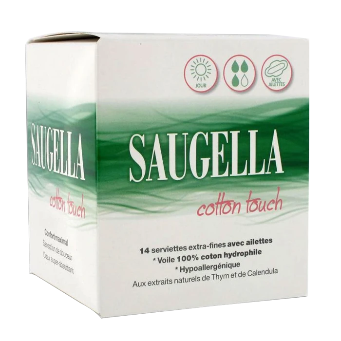 Les Cotton touch serviettes extra-fines jour de Saugella sont hypoallergéniques, dotées d’un voile 100% coton hydrophile et enrichies aux extraits naturels de thym et de calendula pour un confort maximal.