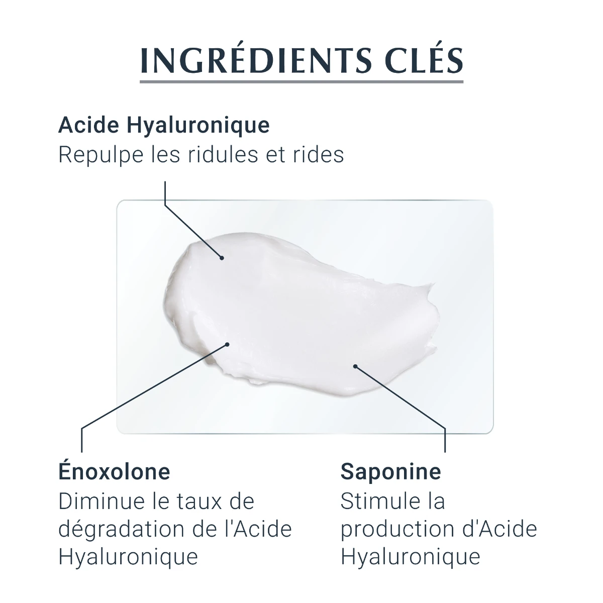 HYALURON-FILLER +3X Effect Soin de Jour SPF15 de Eucerin est un soin quotidien formulé pour contrer les effets du vieillissement cutané. Il contient de l’acide hyaluronique de haut poids et bas poids moléculaire pour hydrater la peau et combler les rides, de la Saponine pour stimuler la production naturelle d’acide hyaluronique et de l’Enoxolone pour diminuer le taux de dégradation de ce dernier. Jour après jour il repulpe le visage, nourrit la peau sèche et empêche les ridules de devenir plus profondes. De plus, grâce à son indice de protection, il prévient du photovieillissement provoqué par l’exposition solaire et protège des radicaux libres. Le visage paraît plus rajeuni, rebondi et unifié.
