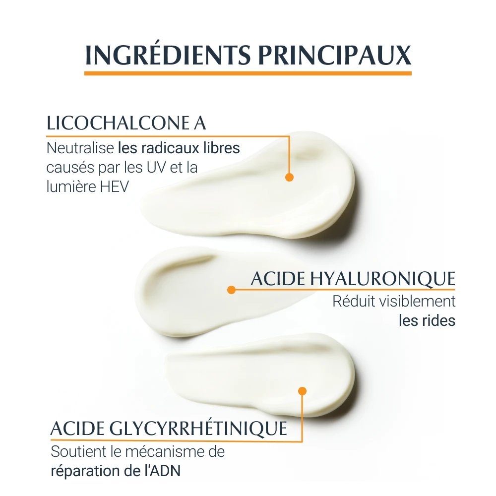 Ce fluide solaire est formulé avec une protection anti-UVA et UVB efficace, une Protection Cellulaire Biologique. Cette dernière est une combinaison d’Acide Glycyrrhétinique aux propriétés antioxydantes, qui contribue aux mécanismes naturels de protection et de réparation de l’ADN, et de Licochalcone A, un puissant antioxydant protégeant les cellules de la peau des dommages causés par les radicaux libres. Pour réduire l’apparence des rides et des ridules, ce fluide SPF50 anti-âge contient également deux types d’acide hyaluronique : de haut et de bas poids moléculaire. Ces composants aident à hydrater la peau du visage.