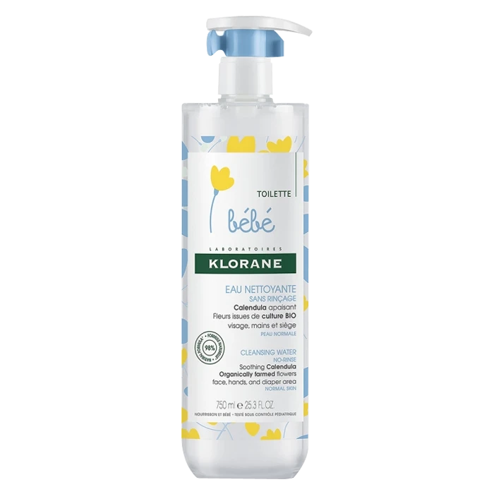 L’eau nettoyante sans rinçage au calendula de la gamme Klorane bébé permet de nettoyer la peau du visage, des mains et du siège de bébé tout en douceur, sans l’agresser, afin de minimiser l’apparition de rougeurs. Composée à 98 % d’ingrédients d’origine naturelle, la formule de l’eau nettoyante Klorane associe des agents actifs hydratants et apaisants.