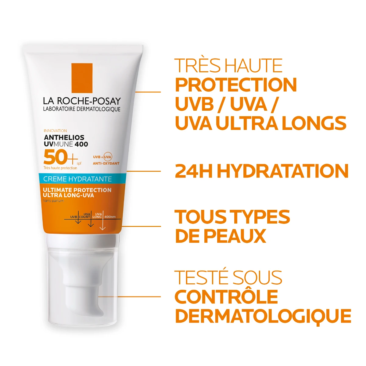La Crème Solaire Hydratante sans parfum Très Haute Protection SPF50+ Anthelios de La Roche Posay contient un nouveau filtre UV Mexoryl 400 issu d’une innovation scientifique, qui renforce la protection contre les UV les plus insidieux, aussi appelés UVA ultra-longs. Parce qu’ils sont imperceptibles et dommageables, ces UV impactent la peau toute l’année.