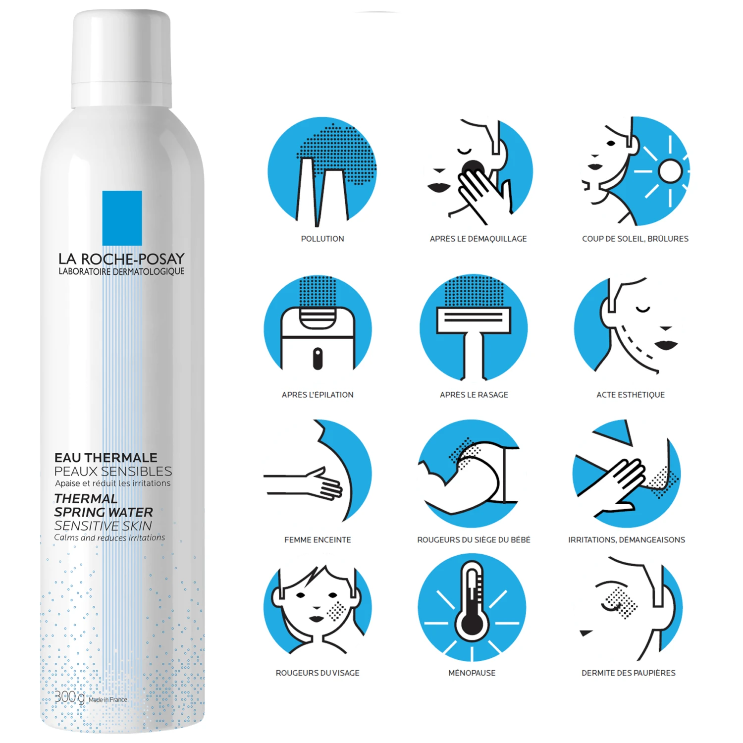 L’Eau Thermale apaisante, adoucissante et anti-irritations pour peaux sensibles est testé sous contrôle dermatologique et pédiatrique.