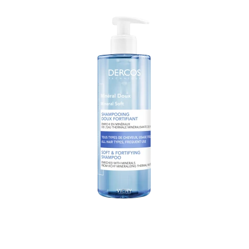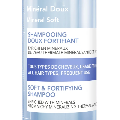 Le Minéral Doux Shampooing Doux Fortifiant de la gamme Dercos de VICHY prend soin des cheveux. Spécialement formulé pour une utilisation fréquente, il contient toute la puissance des minéraux de l’eau thermale de Vichy. En effet, sa formule est riche en fer, un oxygénant naturel, en magnésium qui stimule la régénération cellulaire, en manganèse antioxydant, en silicium qui aide à la régénération tissulaire et en calcium qui est un protecteur cellulaire. Ce véritable cocktail de minéraux est hypoallergénique et Sans silicone pour un toucher naturel.