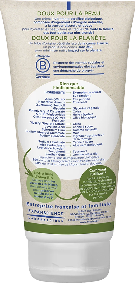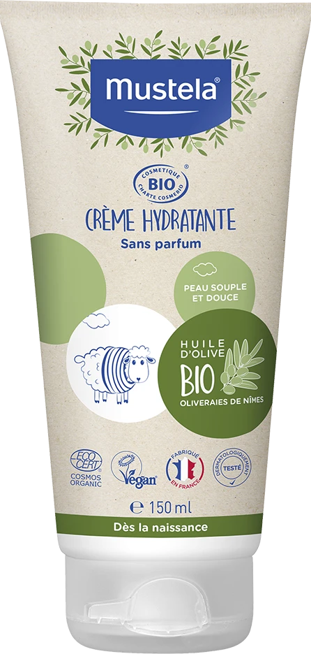 La Crème Hydratante certifiée Bio de MUSTELA est une crème pour le visage et le corps de bébé.