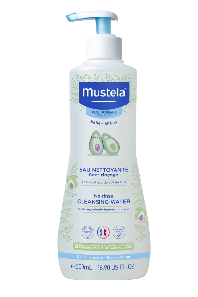 L’Eau Nettoyante Sans Rinçage de MUSTELA convient parfaitement à la peau normale des bébés.