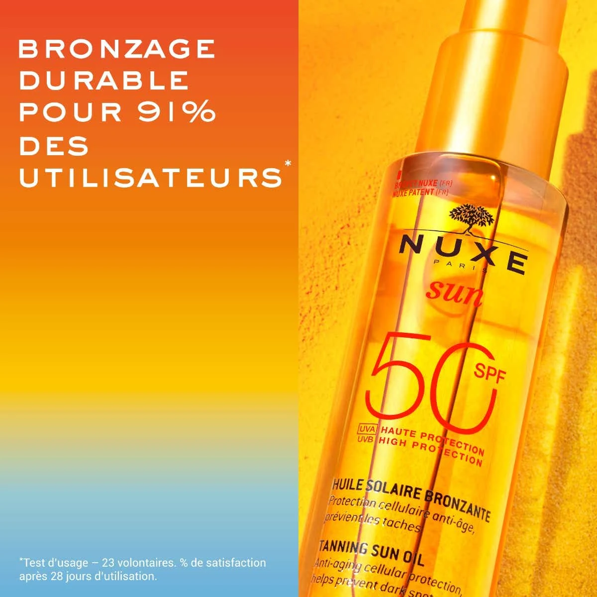 L’Huile Solaire Bronzante SPF50 Nuxe Sun protège visage et corps des rayons du soleil tout en contribuant au respect du milieu marin.