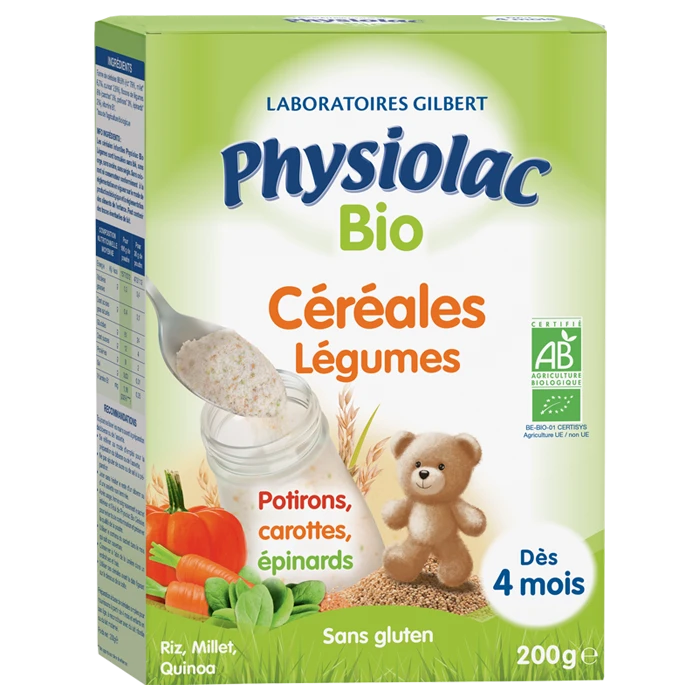 Les Céréales Légumes Bio de PHYSIOLAC sont aux légumes : ils contiennent du potiron, de la carotte et des épinards. Les Céréales infantiles Physiolac Bio Légumes sont la première étape de diversification alimentaire de bébé. Naturellement dépourvues de gluten, sans sucres ajoutés**, elles s’ajoutent au lait maternel exprimé ou au lait infantile correspondant à l’âge de l’enfant.