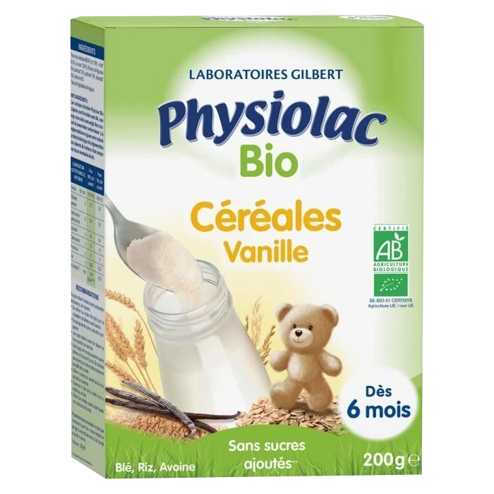 Les Céréales Bio de PHYSIOLAC à la vanille sont adaptées aux besoins des bébés à partir de 6 mois. Sans sucres ajoutés**, à l’arôme de vanille, ces céréales biologiques s’ajoutent au lait maternel exprimé ou au lait infantile correspondant à l’âge de l’enfant.