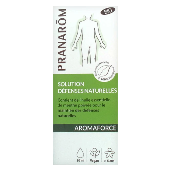 La solution Aromaforce de Pranarôm est formulée avec un mélange d’huiles essentielles biologiques chémotypées, sélectionnées avec soin pour profiter au maximum de leurs propriétés tonifiantes, purifiantes, assainissantes et relaxantes. Convenant aux végans, elle peut être utilisée par voie orale, en inhalation, en massage ou en diffusion afin d’aider l’organisme à se défendre contre les pathologies infectieuses. Cette solution multi-usage du laboratoire Pranarôm contient de l’huile essentielle de niaouli, reconnue pour ses vertus antivirales et antibactériennes. Elle améliore la résistance physiologique de l’organisme et soutient le système immunitaire.