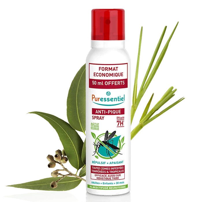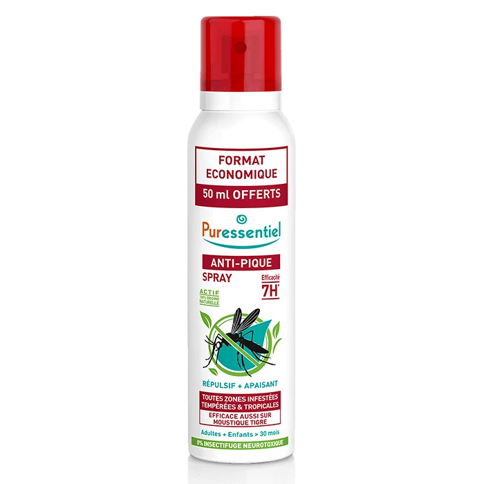 Cet Anti-pique Spray, 200 ml de Puressentiel possède une double fonction très efficace. En effet, il repousse efficacement les moustiques grâce à son actif d’origine naturelle à l’extrait d’huile essentielle d’Eucalyptus citriodora. D’un autre côté, ce produit apaise directement la peau en cas de piqûres d’insectes.
