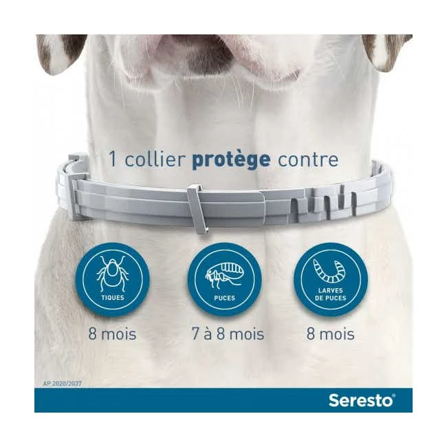Le Collier Anti-Parasitaire Chien Seresto de ELANCO permet, une fois placé autour du cou, de protéger efficacement votre animal des parasites comme les tiques et les puces. Son efficacité dure jusqu’à 8 mois de protection, sans odeur ni gêne pour l’animal. Facile à ajuster, ce collier s’applique facilement et résiste à l’eau.