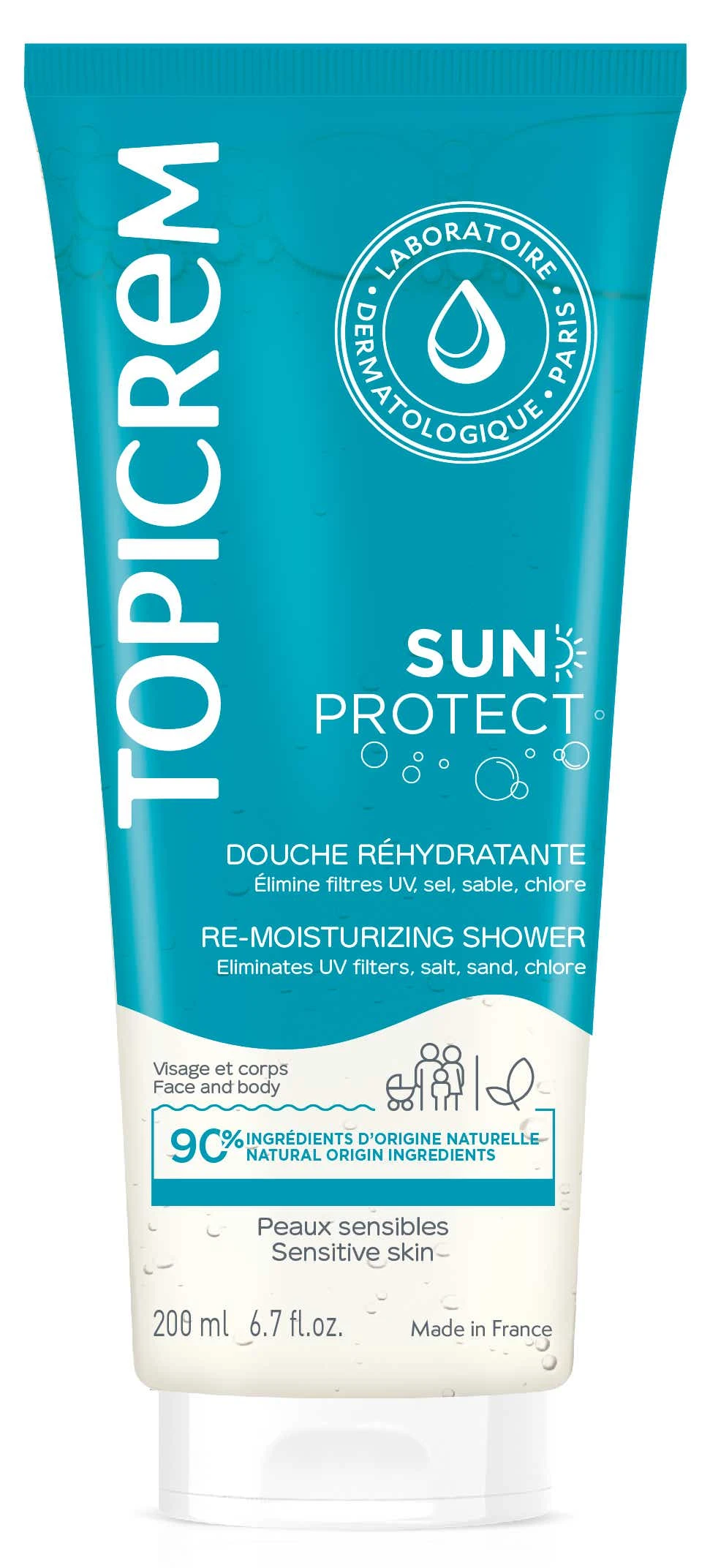 La Douche Réhydratante Sun Protect de TOPICREM, enrichie en dérivé d’Huile d’Olive et en Glycérine, nettoie en douceur et hydrate la peau asséchée de toute la famille.