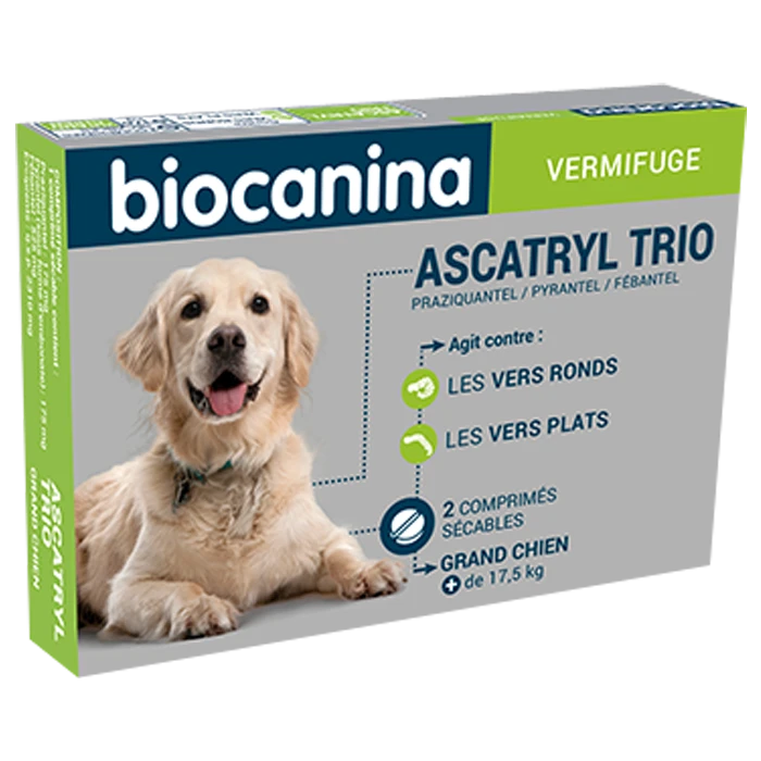 Ascatryl Trio Grand Chien L/XL Arôme Boeuf de BIOCANINA est indiqué chez les chiens de grande taille. Affections à parasites sensibles au fébantel, au pyrantel et au praziquantel.