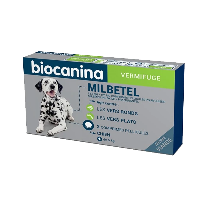 Milbetel Chien de BIOCANINA est un médicament vétérinaire pour chiens indiqué pour le traitement des infestations mixtes par des cestodes (vers plats) et des nématodes (vers ronds) adultes des espèces suivantes :