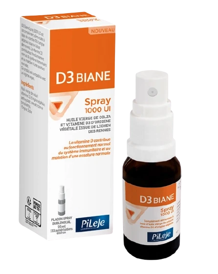 D3 Biane Spray 1000 UI de Pileje est un complément alimentaire dont la formule contient de l’huile vierge de colza et de la vitamine D3 qui contribue au fonctionnement normal du système immunitaire.