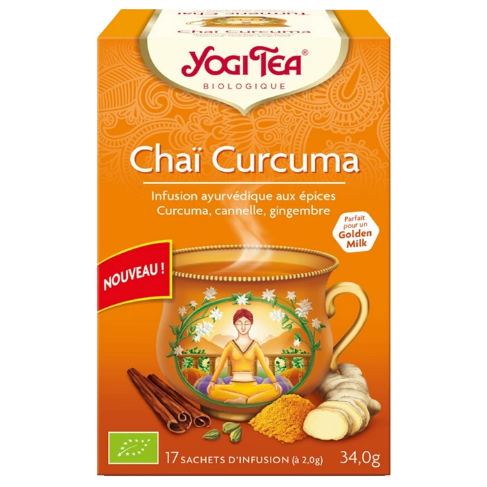 Les chaïs aromatiques et épicés de la marque YOGI TEA se caractérisent par leurs senteurs orientales. Chaï Curcuma est une composition à base de curcuma, aux notes légèrement épicées, de cannelle, à la saveur douce et aromatique, de réglisse, au goût à la fois sucré et amer, et de gingembre, aux saveurs fruitées et piquantes.